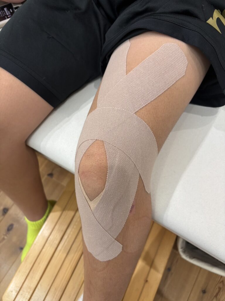今月控えている大切な試合に向けて。 今日は膝の負担を減らし、パフォーマンスを落とさないためのテーピングを実施しました。