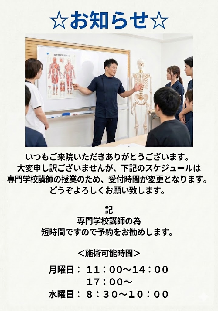 寒暖差により体調を崩しやすい時期ですので、 お身体の不調を感じた際は、お早めにご相談ください。 今月もよろしくお願いいたします。